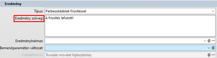 A művelet végrehajtása után megjelenő szöveg megadása. Nem használható a mező a Funkció és a Listaindítás típusok esetén. |