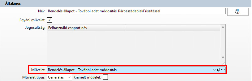 Abban az esetben, ha egy felhasználó a lekérdezés valamelyik eredménymezőjének az értékét szeretné változtatni, péládul a rendelés állapot típusát vagy szövegét, akkor a Művelet mezőben megadott eljárással teheti ezt meg. A művelet eredménye egy eredmény eredményhalmaz függvénye, amit a Műveletdefiníció/ Általános fül/ Eredmény elválasztó sáv alatt található Eredményhalmaz mezőben kell megadni. Ebben az esetben a megadott művelet lefut majd a megadott eredményhalmaz eredményét megjeleníti egy megnyíló ablakban. Az eredeti lekérdezés ebben az esetben nem zárul be.