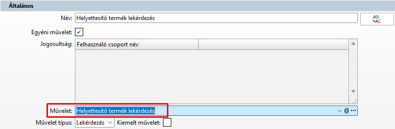 Választható a művelet típusa, ami meghatározza, hogy a szalagon melyik ikon kerül a művelethez hozzárendelésre. A választható értékek: Kitöltés, Nézet, Lekérdezés, Generálás, Egyéb. |