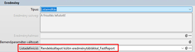Abban az esetben, ha egy felhasználó a lekérdezés valamelyik eredménymezőjének az értékét szeretné változtatni, péládul a rendelés állapot típusát vagy szövegét, akkor a Művelet mezőben megadott eljárással teheti ezt meg. Az eljáráshoz szükséges bemenő paramétereket a Műveletdefiníció Általános fül/Bemenő paraméter gridjében lehet megadni. Az Eredményhalmaz Művelet indítást követően egy párbeszédablakban lehet megadni az új értéket. A Végrehajtás gomb megnyomását követően új űrlap jelenkik meg a képernyőn, ami a Lista megjelenésére és működésére vonatkoznak (például: oldalszám, oldaltörés stb).Ha a Lista alapjául szolgáló eredményhalmazban menüparaméterrel meg vannak adva a listára vonatkozó értékek és tulajdonságok, az űrlap nem jelenik meg. A Listaindítás típusú Eredményhalmaz művelet a kiválaszott sorokon végrehajtott művelet eredményeit- esetünkben a rendelések bizonylat ID-jét - átadja a Műveletdefiníció/ Általános fül/ Eredmény elválasztó sáv alatt található Listadefiníció mezőben megadott listának és az alapjául szolgáló eredményhalmaznak, majd elindul a Listaindítás funkció és megjelennek azok a rendelés bizonylatok, amin a művelet lefutott.