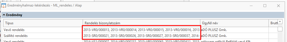 - karakteres mezőn adva vesszővel elválasztva kapjuk vissza az értékeket. Pl.: egy bizonylatszám mezőn a bizonylatszámok lesznek felsorolva: