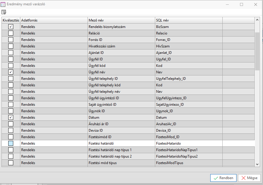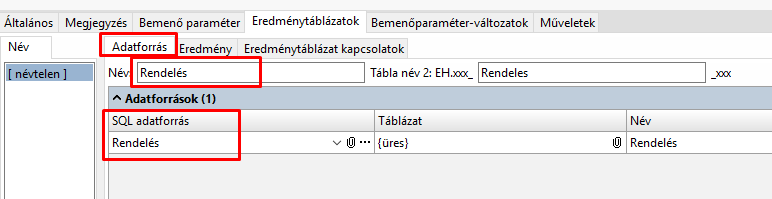 2. Az Eredménytáblázatok fülön elnevezzük (használhatjuk az SQL adatforrás nevét) Rendelésnek az első adatforrást, majd az adatforrásokba beválasztjuk a Rendelés (dbo.AruforgBiz táblát):