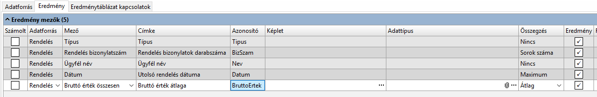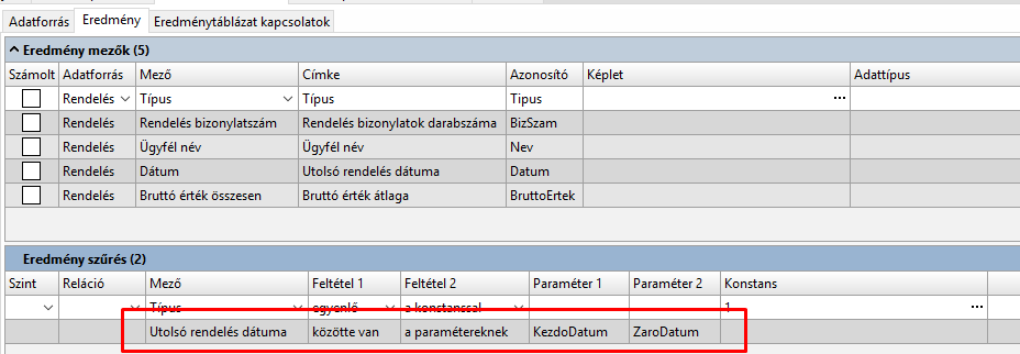 Nézzük ezt egy példával: A vevőrendeléseinket szeretnénk értékelni egy eredményhalmaz segítségével, érdekel, hogy egy adott időszakban egy ügyfél hány megrendelést (vevőrendelés) adott le, annak mennyi az átlagos (bruttó) értéke és mikor rendelt utoljára.