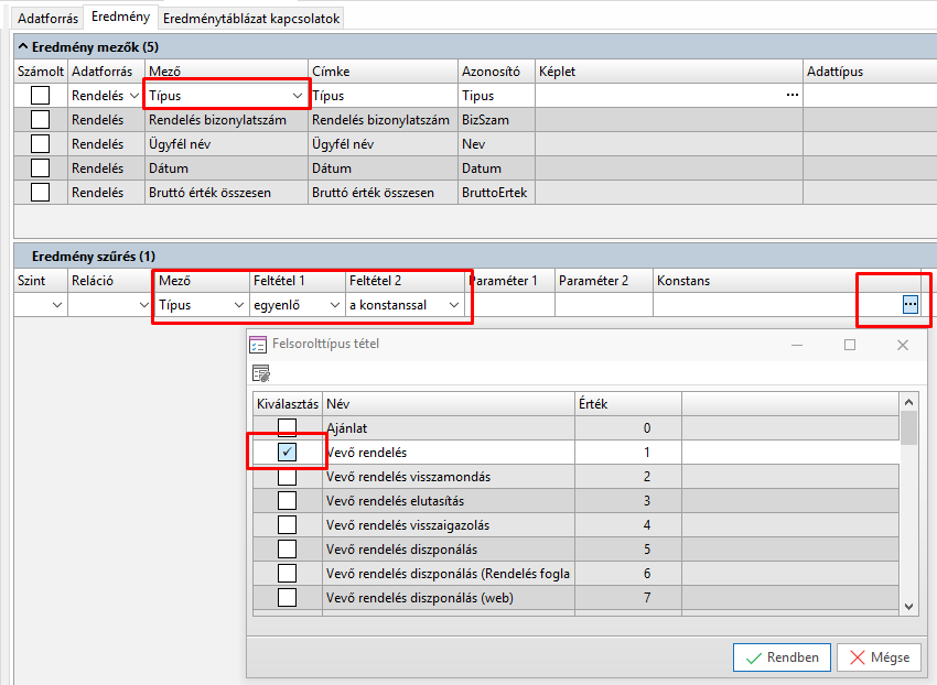 a Típusra állítsuk be a vevőrendelés eredmény szűrést a felsorolt típusra konstanssal: