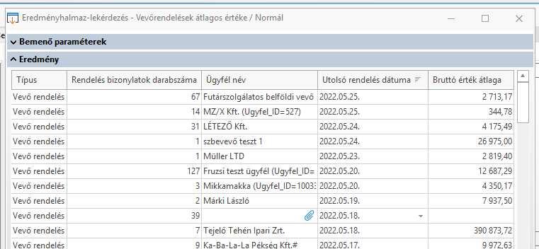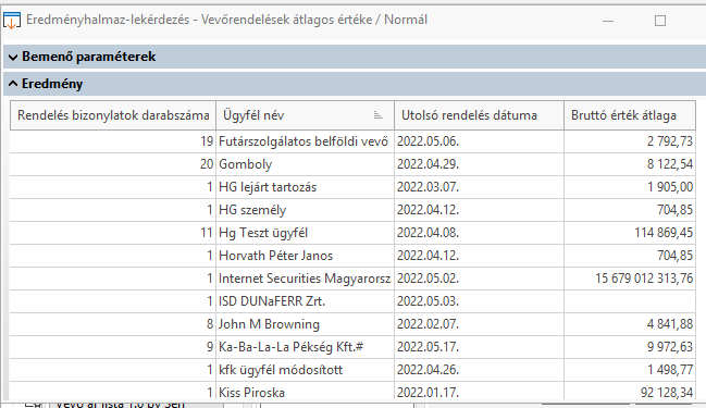 Készíthetünk egy Vevőrendelések átlagos értéke eredményhalmazt: