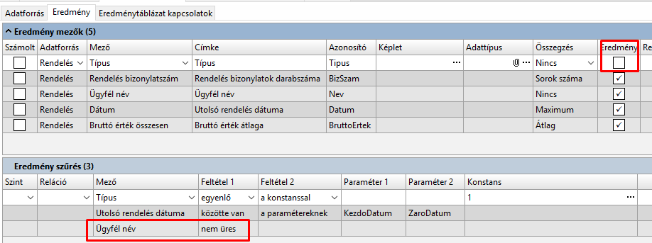 Ezek korrigáláshoz az Eredmény fülön a Típus Eredmény mező megjelenítéséből vegyük ki a pipát és az Eredmény szűrésbe tegyük be, hogy az ügyfél név nem üres.