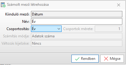 A dátum mezőből készíthetünk két számolt mezőt, példánkban egy Év és egy Negyedév (de lehet akár hónap, nap is...) mezőt. Jobb klikk, Számolt mező létrehozása: