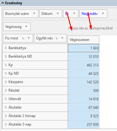 Jelen példában szeretnénk látni azt, hogy az egyes fizetés módokból mekkora bevétel származott, ügyfelenként, időszakonként.