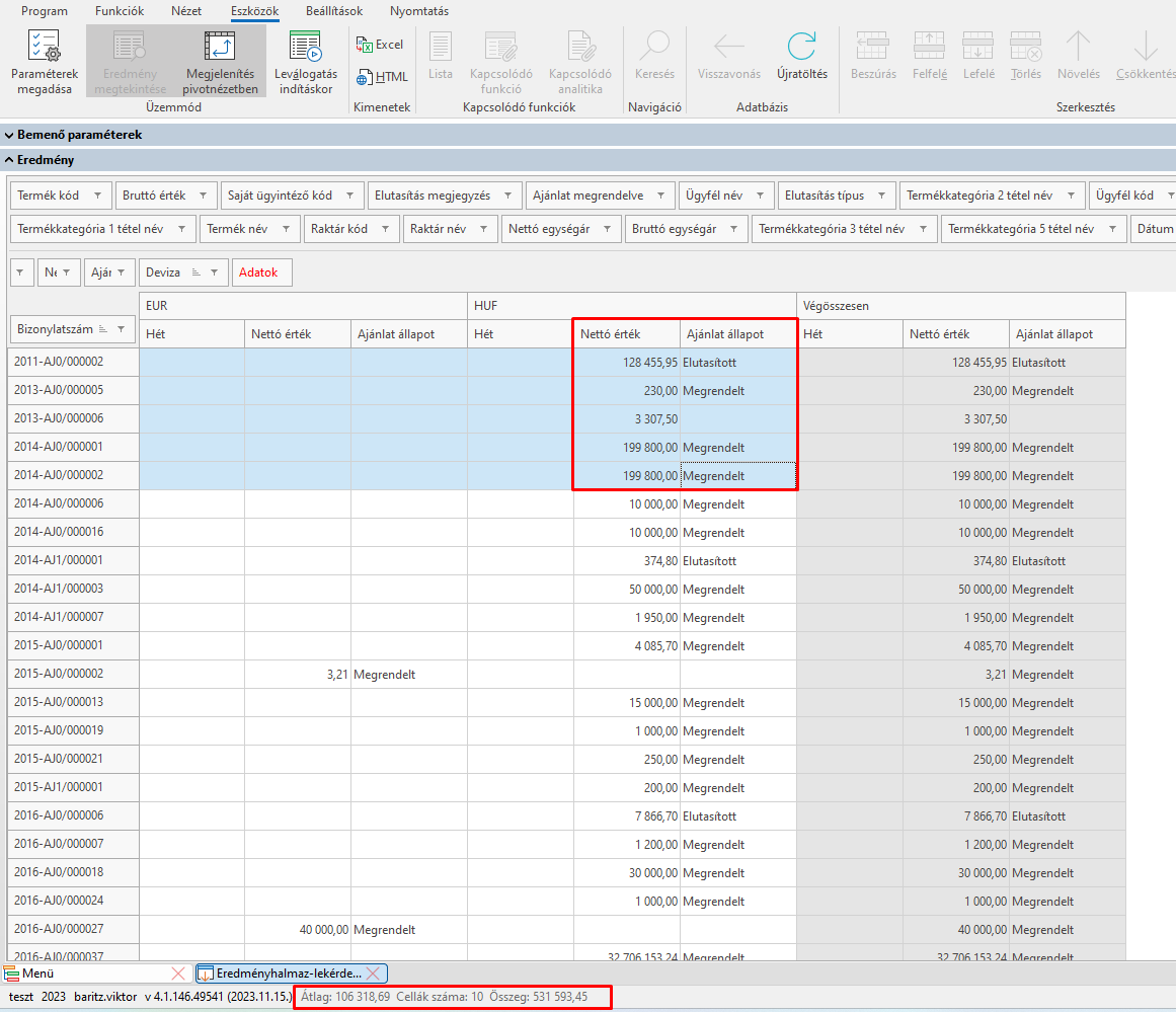 Az eredményhalmaz-lekérdezésnél a pivot nézetben a kijelölt mezők értéke, darabszáma és átlaga megjelenik az állapotsorban.