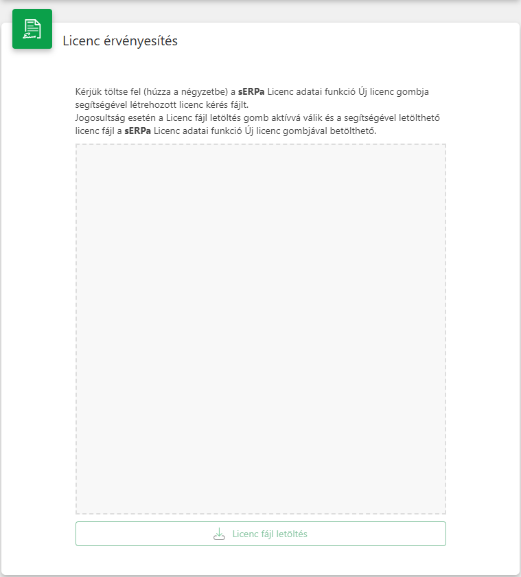 3. Az így kapott fájl az offline környezetbe továbbítva, a sERPában az Érvényesítő kód / Licenc fájl feltöltése funkcióval lehet az érvényesítéshez betölteni. A Licenc adatai funkcióval ellenőrizhetők, a beállított új érvényesítő kód szerinti programhasználati jogok.