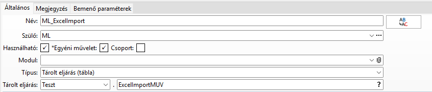 A művelet bevitel funkcióban a "Tárolt eljárás (tábla)" típust kell használni. Ezt a tárolt eljárást kell majd később az import művelet definiálásakor használni.