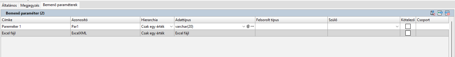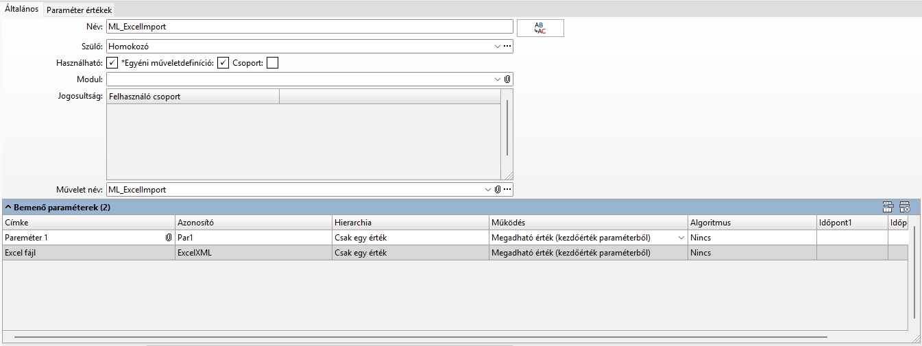 A művelet bemenő paraméterei között kell szerepelnie az ExcelFile kontroll, amivel ki tudja a felhasználó választani, mely xlsx fájlból szeretné beolvasni az adatokat.