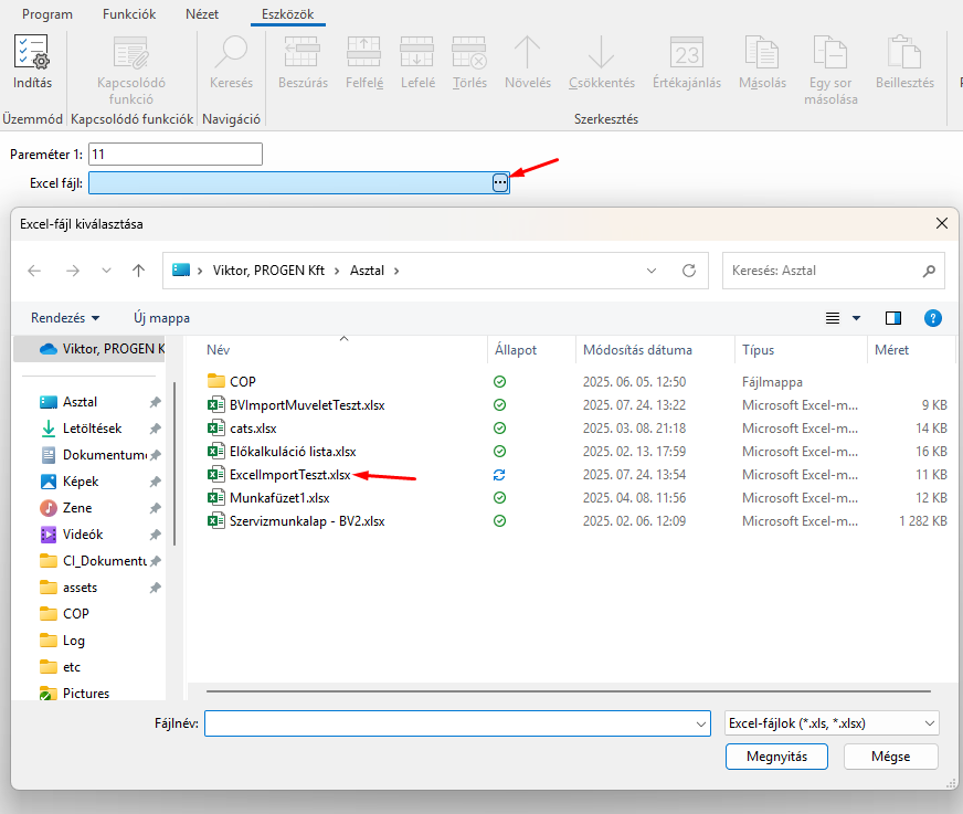 A művelet elindítását követően a felületen megjelenő kontroll jobb oldalán található "..." jelre kattintva, a felugró ablakban választható ki az excel fájl.