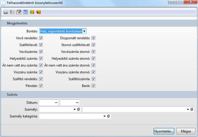 Funkció elérése menüszerkesztéskor: Rendszerfunkciók / Listák / Felhasználónkénti bizonylatösszesítő