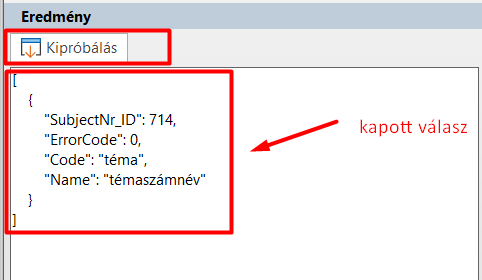 2. Az Eredmény alatti Kipróbálás gombra kattintva, megkapjuk a JSON formátumú visszajelzést. Megkapjuk a témaszám ID-t (SubjectNr_ID), amit a rendszer generált le, illetve a hibakódot is (ErrorCode), ami helyes felvétel esetén 0 értékkel rendelkezik.