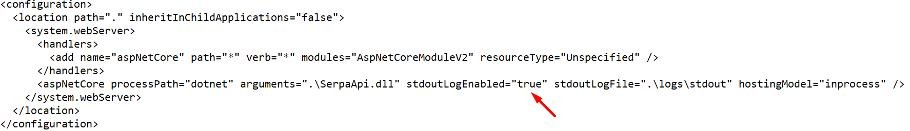 Ha még mindig nincs semmilyen log bejegyzésünk, kapcsoljuk be a stdoutLog-ot a web.config fájlban: Állítsuk le az Application Pool-t. nyissuk meg a Jegyzettömbben a web.config fájlt, a stdoutLogEnabled-et állítsuk true-ra: