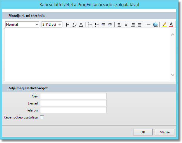 Funkció elérése menüszerkesztéskor: Rendszerfunkciók / Kapcsolatfelvétel a PROGEN tanácsadó szolgálatával