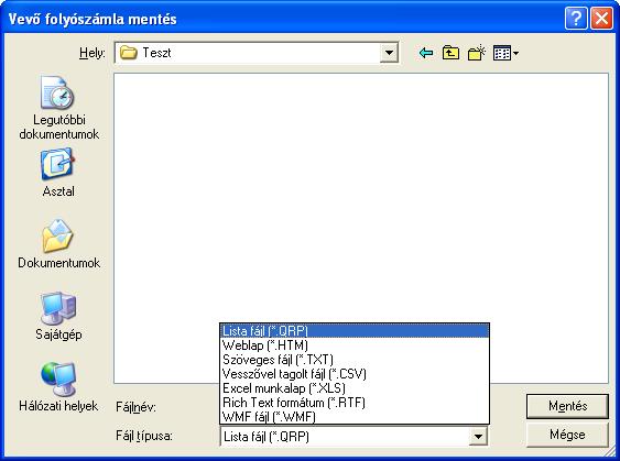 Listát közvetlenül a program valamely lista funkciójából képernyőre történő lehúzáskor menthetünk el a Lista / Mentés (CTRL+M) választása esetén az alábbi párbeszédablak kitöltése után pl. *.QRP kiterjesztéssel: