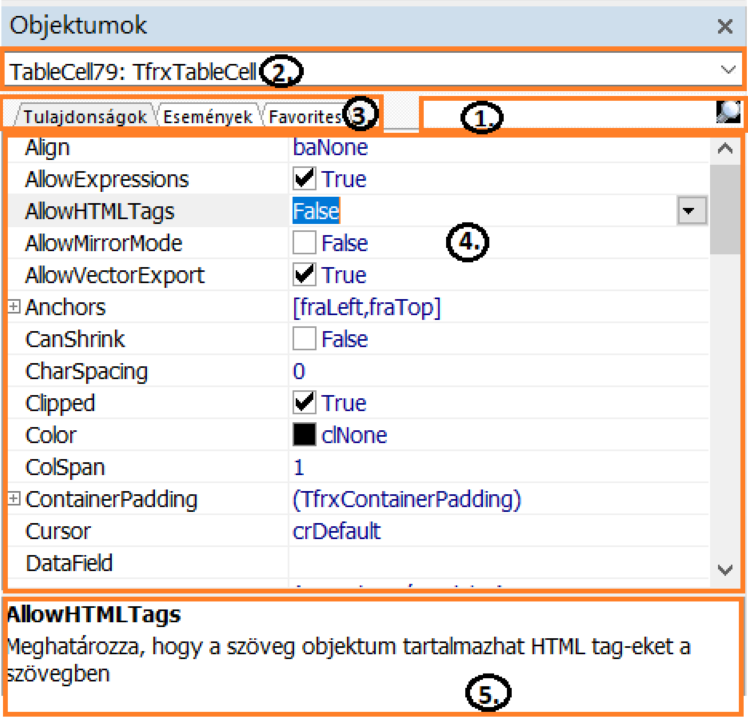3.Fülek - 3 darab fület különboztetünk meg: Tulajdonságok, Események, Favorites (magyarul Kedvencek). A Tulajdonságok fül alatt találhatóak objektumtól függően az olyan tulajdonságok, mint a szín, méret, stb. találhatóak. Ezeknek nevei angolul jelennek meg, de a Súgó részen magyarázat is rendelkezésünkre áll magyarul. Az Események fülön az objektumhoz fűzhető események listáját látjuk objektum függően, pl. nyomtatás előtt mi történjen, stb. Szintén angolul jelenik meg, súgó itt is segít. A Favorites fülön a kedvencnek jelölt tulajdonságaink és eseményeink jelennek meg. Kedvencnek úgy jelölhetünk meg tulajdonságokat, ha a CTRL billentyűt nyomjuk, miközben a másik két fül valamelyikén állunk, és a tulajdonságok/események nevei előtt megjelenő jelölőnégyzetet igazra állítjuk.