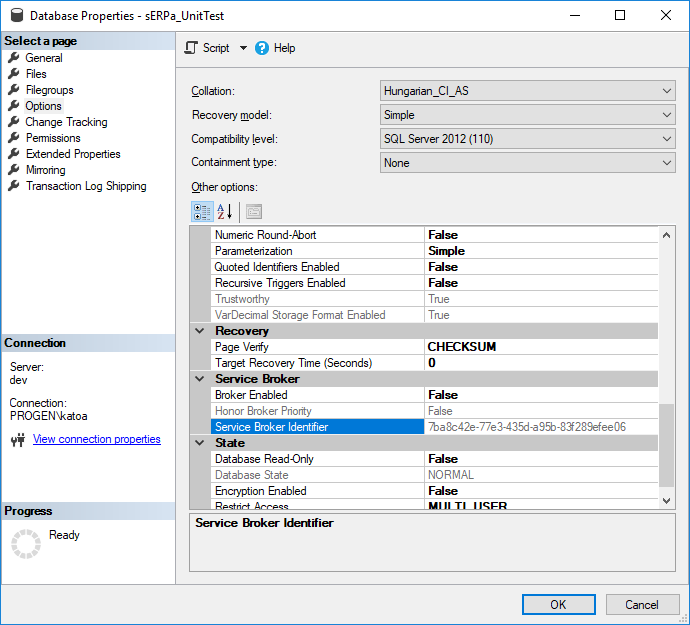 Ha szükség van a Szerviz broker GUID-ra akkor: SERVER: Database: [adatbázis]: Properties: Options: