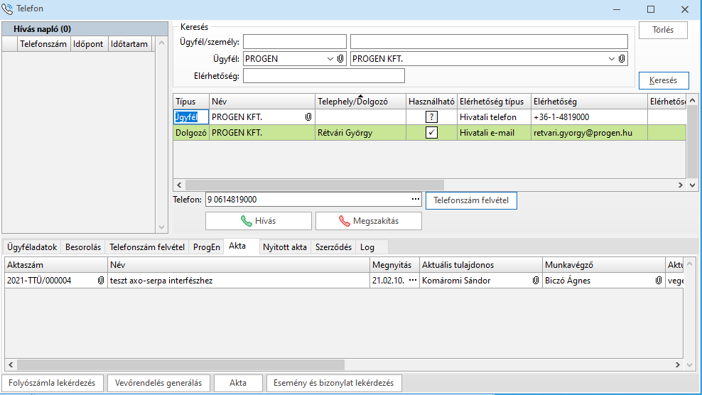 Progen modul megléte esetén Bejövő híváskor , vagy a funkcióban Ügyfél keresésekor a ProgEn fül az alapértelmezetten aktív.