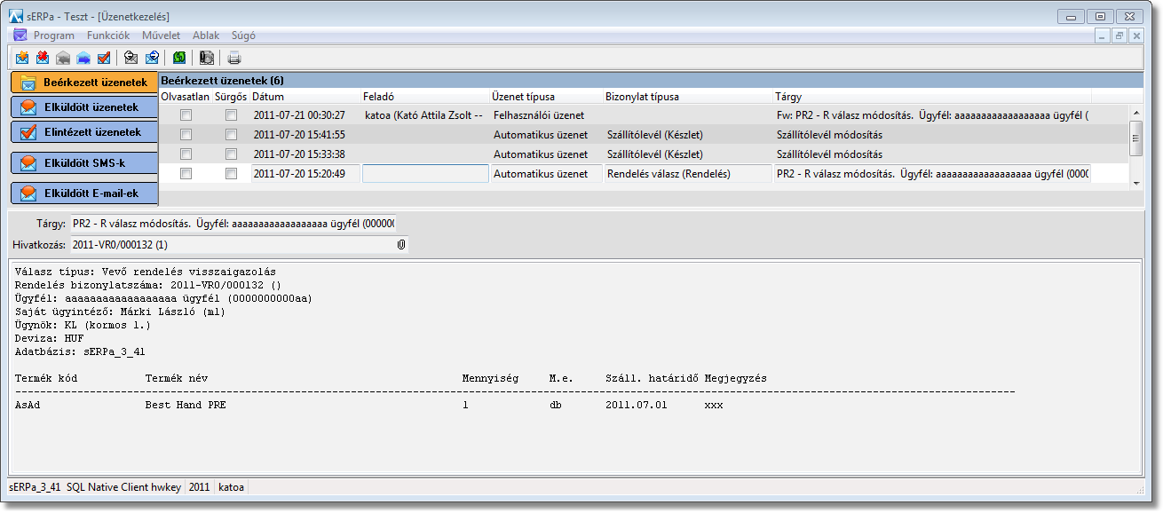 Lehetőség van arra, hogy az azonos adatbázisban tartózkodó felhasználók a sERPán belül üzeneteket küldjenek egymásnak.