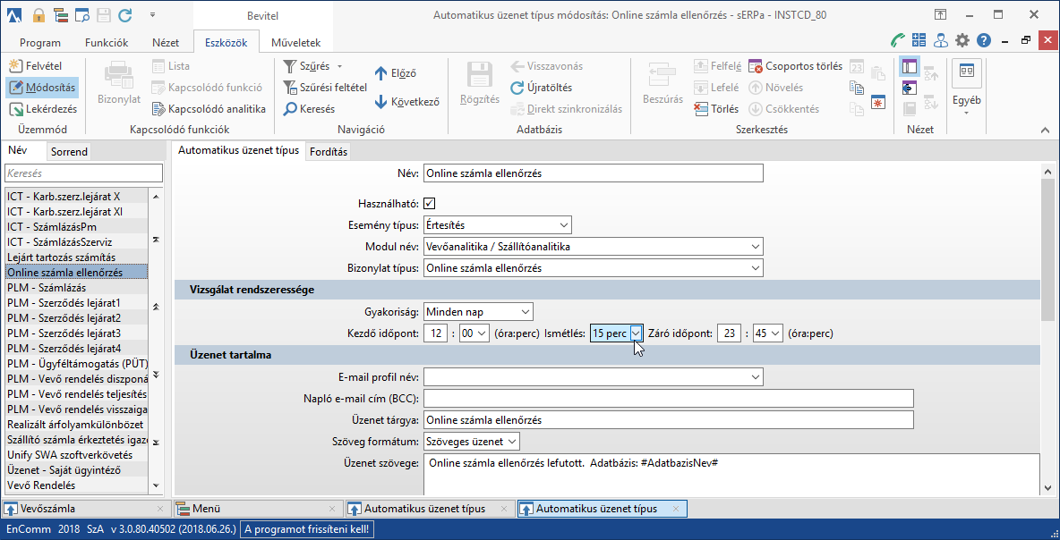 A bizonylat típust választva olyan automatikus üzenetet hozhatunk létre, amely megpróbálkozik azoknak a számlák adatainak a beküldésével, amelyek a számla nyomtatásakor valamilyen okból (kommunikációs hiba, NAV túlterheltség ... ) nem küldődtek el a NAV-nak. Az ilyen típusú üzenetet hasznos lehet ismétlődő időpontra beállítani. (A beállítás nem azt jelenti, hogy a beküldés pontosan 12:00-kor, 12:15-kor ... fog történni. az így ütemezett feladat a 12:00 és 12:15 közötti időintervallumban valamikor le fog futni.)