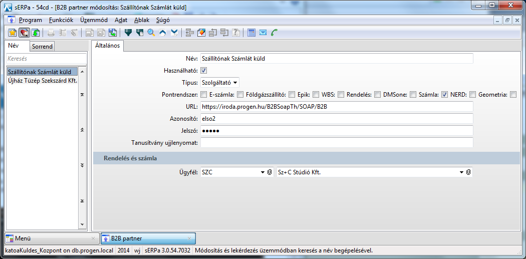 Vevő számlát küldő adatbázisban a B2B partner funkcióban fel kell venni Szolgáltató típussal, Számla pipával, a megfelelő URL, Azonosító és Jelszóval az Ügyfelet, akinek át akarjuk küldeni az adatbázisába a vevő számlát, hogy ott szállító számlaként jelenjen meg. A küldő és a fogadó adatbázisban megadott jelszót máshol (az IIS-ben) nem kell megadni csak a két sERPa adatbázis B2B partner funkciójában. Ezzel azonosítja be egymást a két adatbázis. Az URL mező megadására példa: