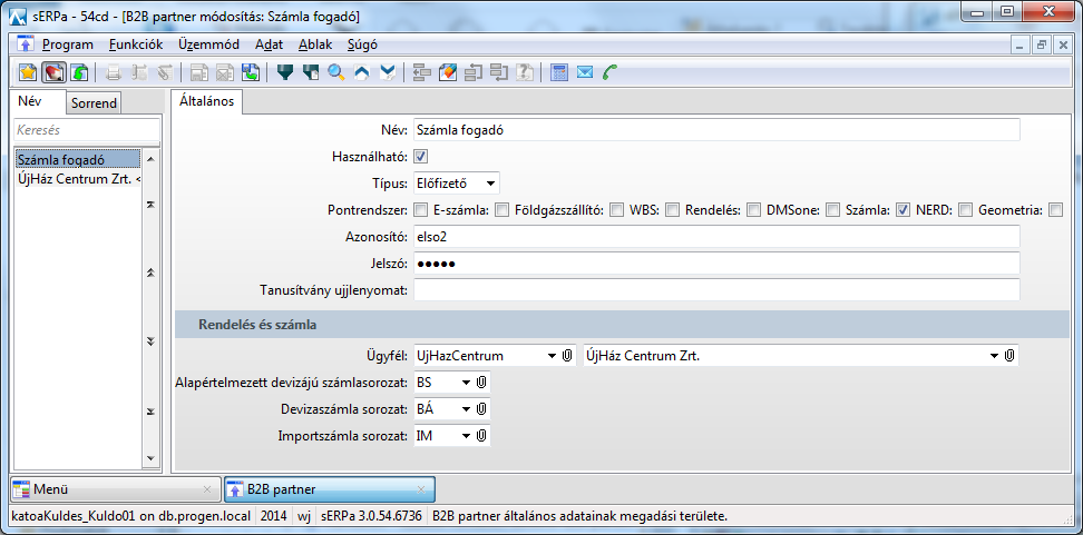 A Szállító számlaként fogadó adatbázisban a B2B partner funkcióban fel kell venni Előfizető típussal, Számla pipával, a megfelelő Azonosító és Jelszóval az Ügyfelet, akitől szállító számlát akarunk kapni (az ő vevő számlájából) és meg kell adni számlatípusonként a szállítószámla sorozatokat, amelyre a szállítószámla kerülni fog. Az azonosítónak és a jelszónak meg kell egyeznie a küldő adatbázisban meghatározottal.