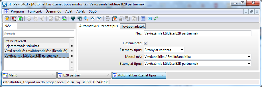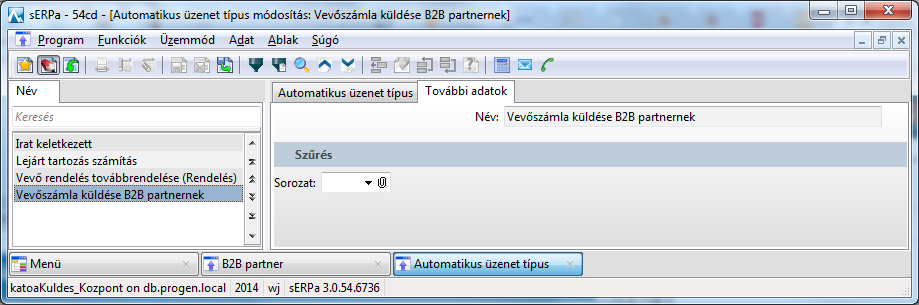 A küldő adatbázisban az Automatikus üzenet típus funkcióban be kell állítani a "Vevőszámla küldése B2B partnernek" Bizonylat változás típusú automatikus üzenetet, amelyben meg kell adni, hogy mely vevőszámla sorozatra felvett vevő számláról mehessenek át az adatok a fogadó adatbázisba.