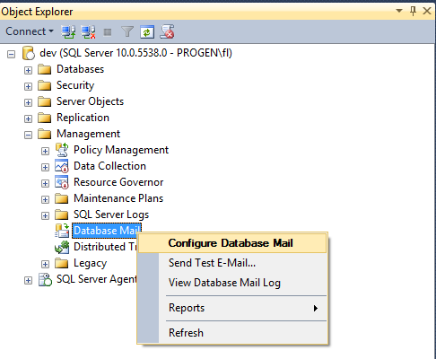 A Management Studioban Database mail, jobb klikk és Configure Database mail: