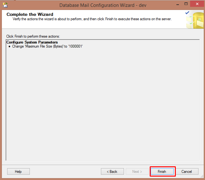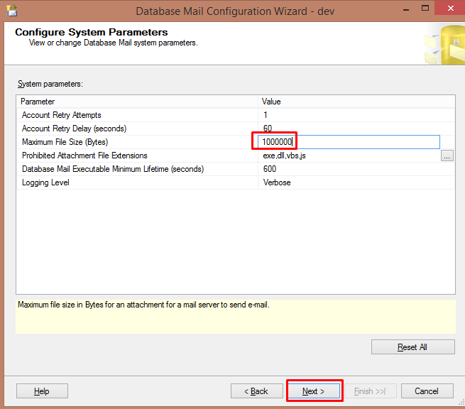 8. Ha az e-mail nem érkezik meg és a hibanaplóban "Az e-mail nem küldhető el!" hibaüzenetet látjuk, akkor előfordulhat, hogy a kiküldendő kerülő fájl mérete meghaladhatja az SQL-ben beállított értéket. Ez esetben két dolgot tehetünk. Vagy csökkentjük a fájl méretét úgy, hogy az adatforrásban szűréseket állítunk be, vagy az SQL Database mail beállításait módosítjuk az alábbiak szerint: