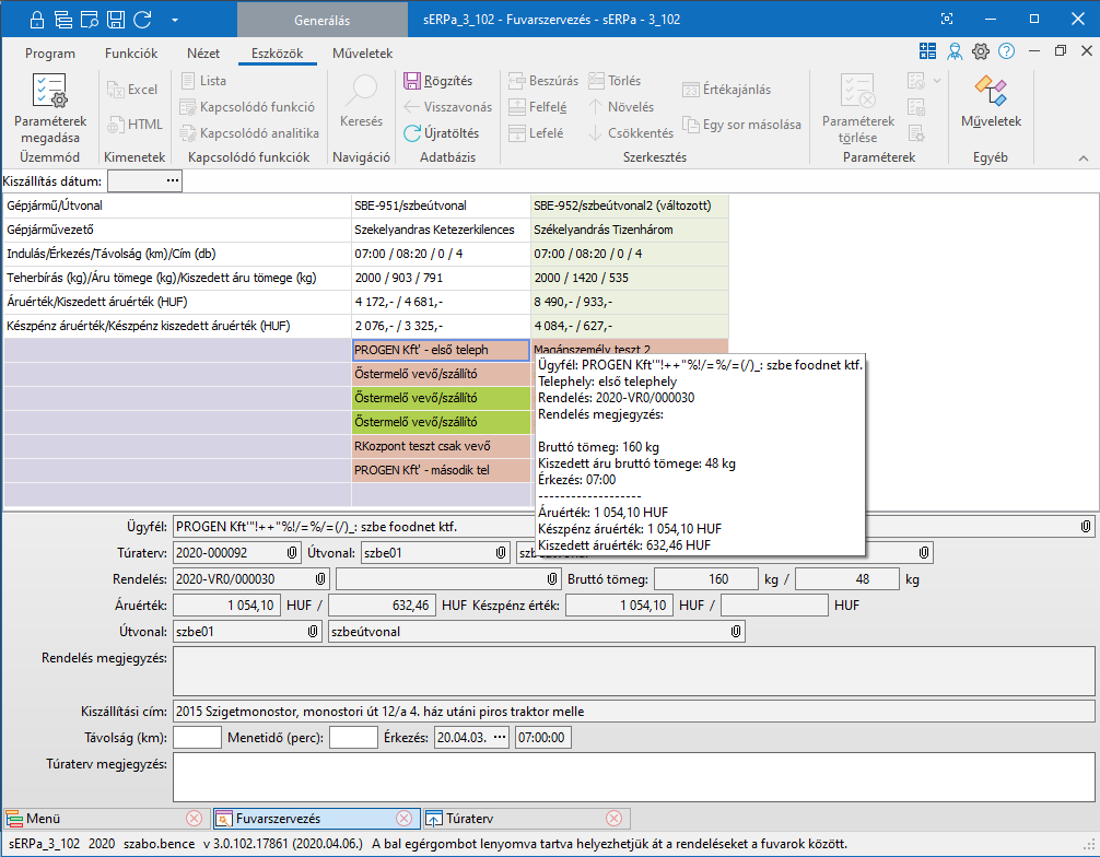 A következő sorokat láthatjuk táblázatfejlécként: Gépjármű / Útvonal - A gépjármű rendszáma / Útvonal (ha tartozik a túratervhez útvonal)(útvonal név) Gépjármű vezető - A gépjármű vezetője Indulás / Érkezés / Távolság (km) / Cím (db) - Indulás időpontja, visszaérkezés időpontja, a megtett távolság km-ben, és a címek száma (db). Teherbírás (kg)/Áru tömege (kg)/Kiszedett áru tömege (kg) - A gépjármű teherbírása kg-ban (együttes tömeg - saját tömeg) - A rendelésekben szereplő tételek (melyek állapota nem elutasított/visszamondott) termékek tömege kg-ban, amely ha Tömegadatok forrása = Rendelés, akkor az itt látható érték alapján színezzük pirosra, amikor is túlterheltté vált a jármű - A rendelésekhez kapcsolt szállítólevelekben szereplő tételek mennyiségének bruttó tömege (azon a rendelésen, amelyiken nincs kapcsolt szállítólevél,.ott a visszaigazolt + diszponált mennyiséget vesszük), ha Tömegadatok forrása = Szállítólevél, akkor a túlterheltséget az itt látható mennyiség alapján számoljuk. Ezt a működést akkor érdemes alkalmazni, ha a rendelést jellemzően egy menetben szedik ki. Így ha már megtörtént a kiszedés, de még nem utasítottuk el a ki nem szedett részt, akkor is helyes adatot mutat a program.) Értékek megjelenítése = Igen esetén megjelenő új sorok: Áruérték / Kiszedett áruérték - az adott oszlopban szereplő rendelések áruértéke összesen - Amennyiben csatolva van hozzá szállítólevél, akkor azon szereplő mennyiség értéke. Készpénz áruérték / Készpénz kiszedett áruérték - Az adott oszlopban szereplő Készpénzes fizetési módú rendelések áruértéke összesen. (Olyan rendelések, szállítólevelek, amelyeknél nincs megadva fizetési mód, azokat nem Készpénzes fizetési módúként kezeljük. ) - Amennyiben csatolva van hozzá szállítólevél (amely készpénzes fizetési módú), akkor azon szereplő mennyiség értéke. A sorokban a rendeléseket, az oszlopokban pedig a gépjárműveket látjuk, amelyek között az ütemezést a cellatartalom "áthúzásával" elvégezhetjük.