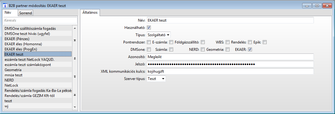 A B2B partner funkcióban adjuk meg a NAV felületen kapott felhasználó nevet, jelszót és XML titkosítási kulcsot. A Típus legyen Szolgáltató, pipáljuk ki az EKÁER pipát, és állítsuk be a Szerver típusát.