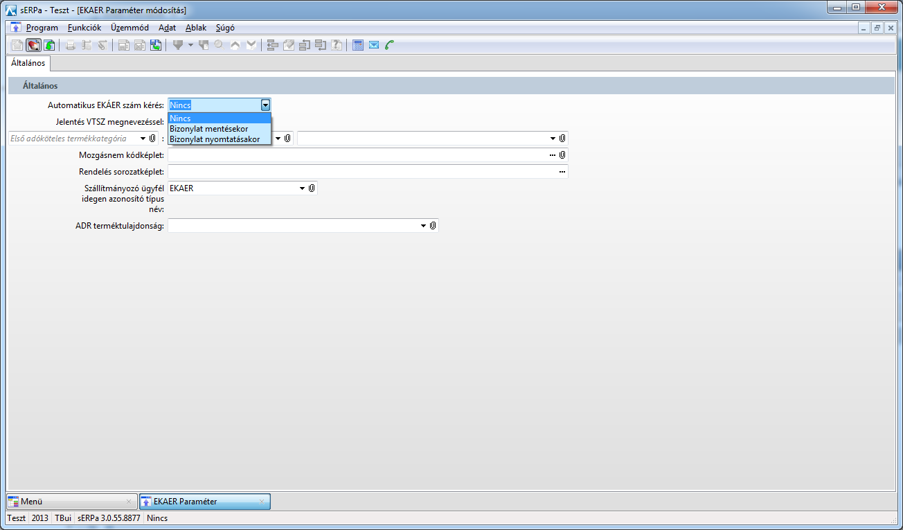 Az EKÁER bejelentéshez szükséges paramétereket állítsuk be az EKÁER paraméter bevitelben.