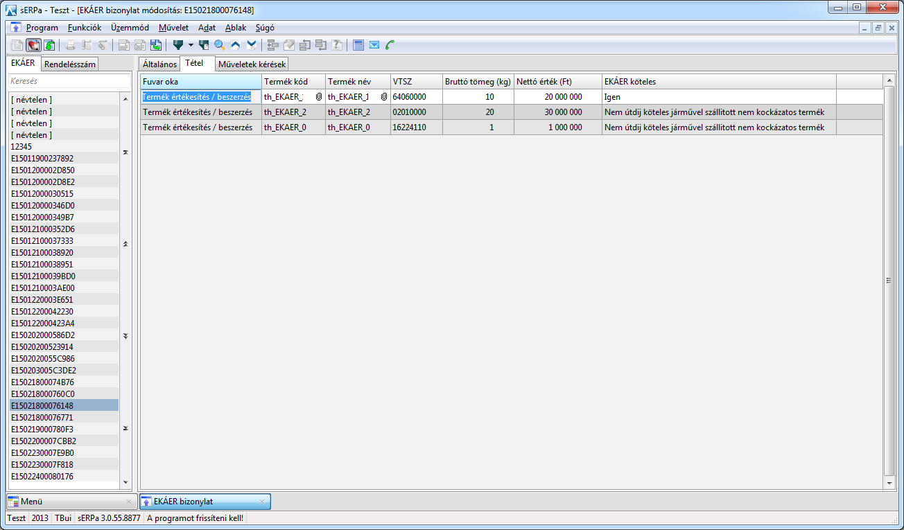Az EKÁER bizonylat minden tételénél látszik az EKÁER jelentési kötelezettség: