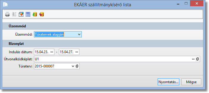 Funkció elérése menüszerkesztéskor: Készlet / EKÁER / Listák / EKÁER szállítmánykísérő lista