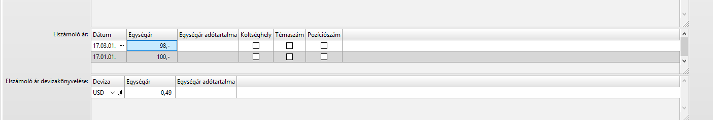 Készleten lévő elszámolóáron nyilvántartott termékek adott időszakra érvényes elszámolóárának megadása.