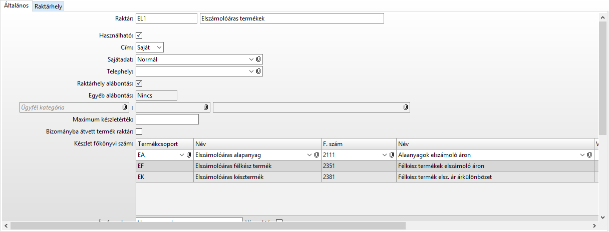 2. Raktár beállításai (opcionális): A termékcsoportonként különböző nyilvántartási főkönyvi számok megadása.
