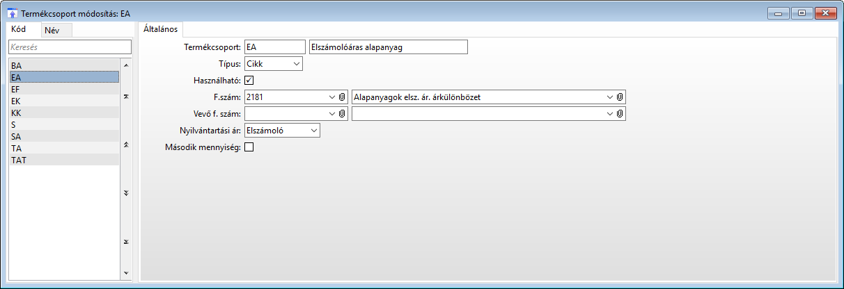 1. Termékcsoport beállítása:A termékcsoport elszámolóár küólönbözet főkönyvi szám megadása. Beszerzés esetén erre a főkönyvi számra kerülnek a szállítóval szemben könyvelt tételek nettó értéken. Saját termelés, gyártás esetén vegyes könyveléssel kell az 581 főkönyvi számmal szemben az adott időszaki tényleges költségek értékét lekönyvelni erre a főkönyvi számra.