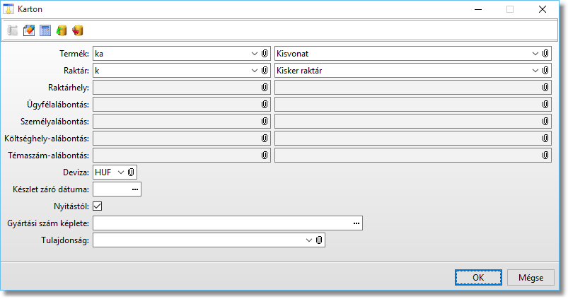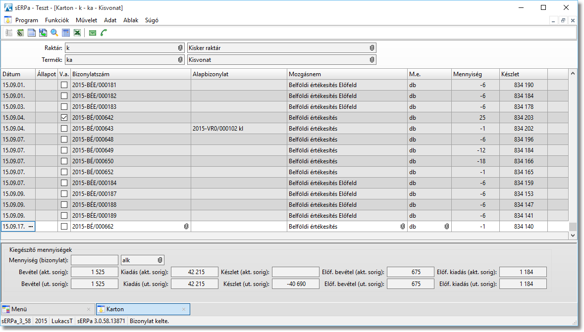 A termék raktári kartonjának képernyőn történő megjelenítésére szolgál a funkció. Elindításával megtekinthető, hogy az egyes mozgások (szállítólevél) időrendben hogyan alakították ki a termék készleten lévő mennyiségét.