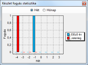 Az alábbi ablakban a heti/havi fogyás adatok kerülnek megjelenítésre értékben és grafikusan - oszlop diagrammal is. A fogyás mérése a Készlet struktúrában, a Raktár funkció rendelés nyilvántartás fülén beállított értékek alapján történik.