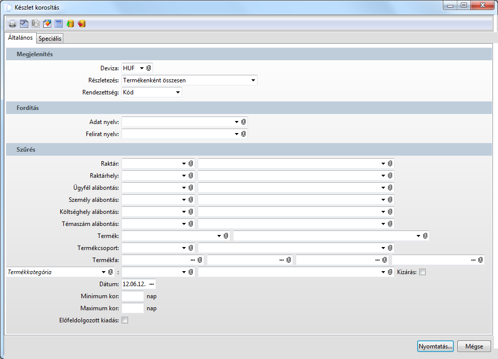 A funkció megadható szűrésekkel megfelelően kilistázza a raktárkészletet vagy az összes beszerzéseket kor szerinti bontásban. Fontos tudnivaló, hogy csak a adott időpontban készleten lévő tételeknek van koruk.
