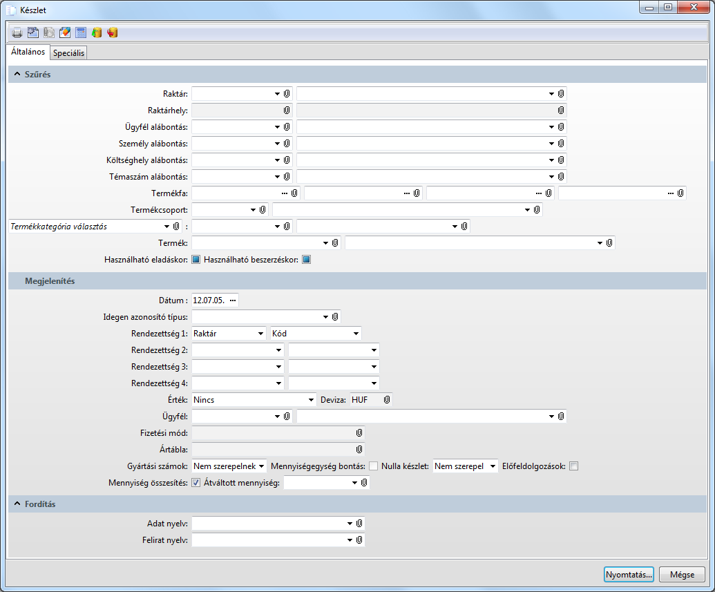 A funkció kilistázza különböző rendezettségekkel a készlet mennyiséget és értéket, a készleten lévő gyártási számok és az átváltásnak megfelelő mennyiségi egységenkénti bontás feltüntetésének lehetőségével.