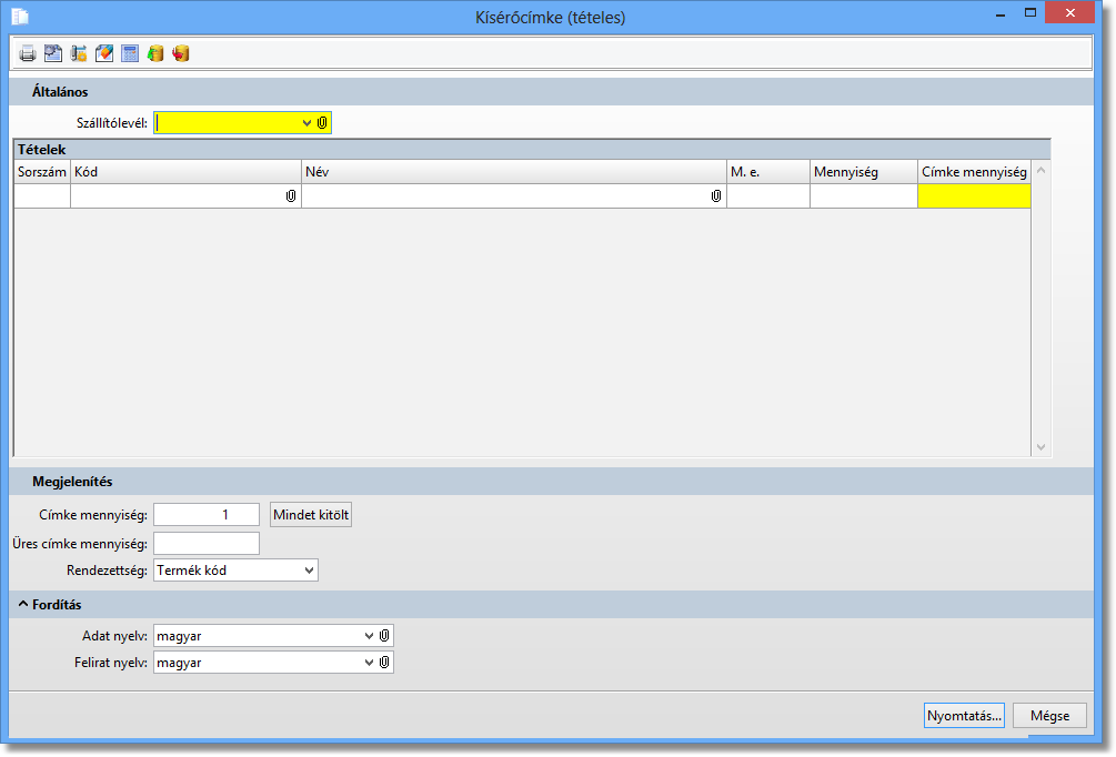 A funkcióval a kiválasztott szállítólevél tételeire vonatkozó kísérőcímkéket nyomtathatunk (pl. felragasztható a csomagolásra) különböző mennyiségekben, az alábbi adatokkal: raktárkód, raktárhely kódja, egyéb alábontás kódja, termékkód, mennyiség, mennyiség egység, valamint termék megnevezése.