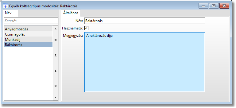 Az Egyéb költség típus funkcióban fel kell vennünk azokat az egyéb költség típusokat, amiket szeretnénk használni, ezt a folyamat közben is bármikor megtehetjük: