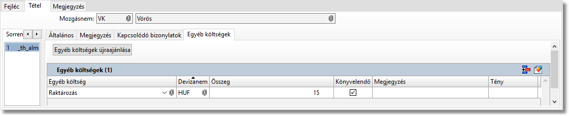 Ezen felül a tétel fül, egyéb költség fülén az egyéb költség újraajánlása gomb segítségével újra beajánlhatjuk a az egyéb költség értékét.