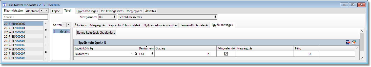 Majd az OK gomb megnyomásával lehet véglegesíteni, ilyenkor a szállítószámla tételben az egyéb költség fülön látható a kapcsolat: