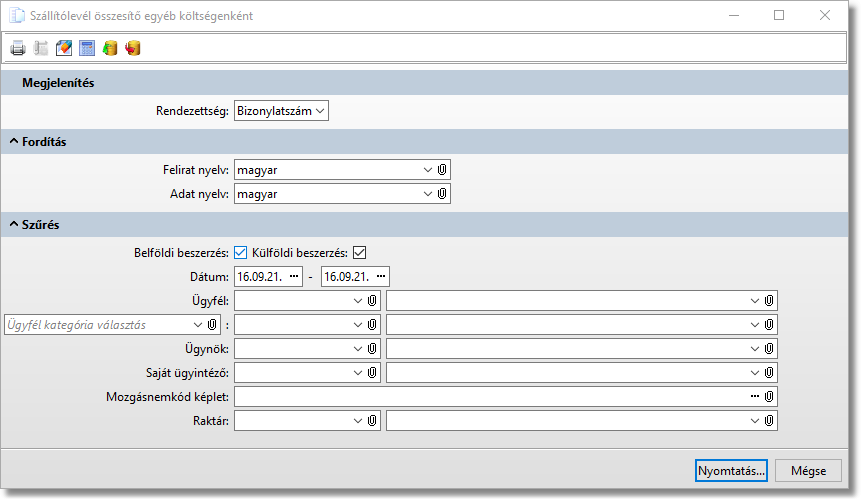Funkció elérése menüszerkesztéskor: Készlet / Listák / Szállítólevél összesítő egyéb költségenként