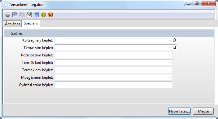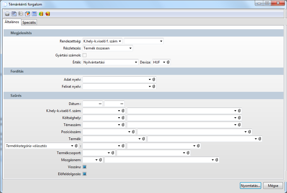 A bevétel, belföldi értékesítés, külföldi értékesítés, kiadás, raktárközi típusú mozgásnemekben megadott költséghely-költségviselő főkönyvi szám, költséghely, témaszám, pozíciószám szerinti rendezettségekben kigyűjthető a forgalom tételesen dátum, bizonylatszám rendezettséggel, vagy cikkre összesítve. Tételes esetben igény szerint megjeleníthetők a gyártási számok is.